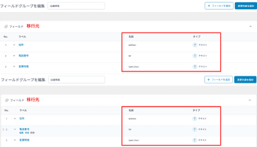 例えば、移行元の「tel」のデータはテキストタイプであるにも関わらず、移行先の設定で「tel」のデータタイプを番号などにしていた場合、データの不整合が起きて空欄のまま取り込まれることになります。