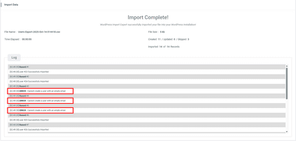 また、通常WordPressでユーザー登録する際に必須となっている項目「ユーザー名」と「メールアドレス」が空欄の場合はインポート処理から除外されてしまいます。